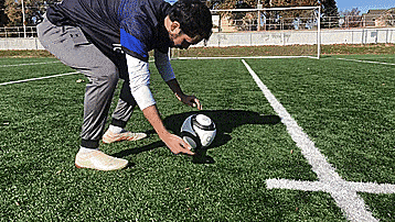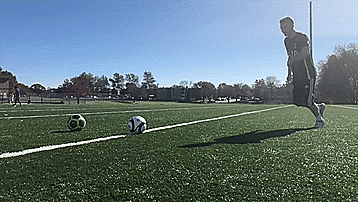 第一个是外脚背射门,外脚背射门有一点我们要记住,这一点非常非常重要,我们要直线接近球,而不是像我们平常射门一样从侧面接近。