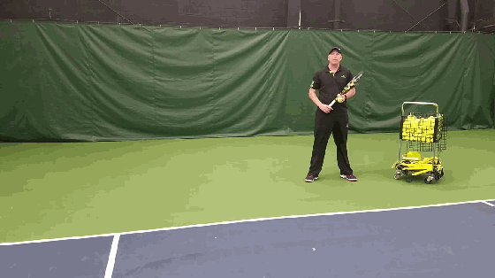 先转体引拍做好击球准备后再原地抛球击打。要注意将球抛在身体约45度位置,不要太靠近身体。