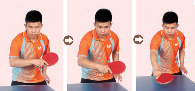 动作描述:1.引拍时将前臂往腹部后收,使持拍手靠于身体前方近胸部位置,拍面前倾。2.击球时身体重心略往右脚转移。