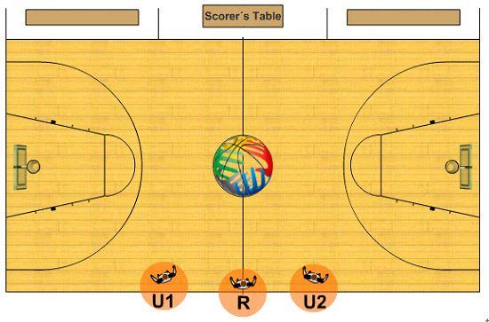 C(中央)裁判是位于L所在前场的对侧的裁判员(通常在球侧对面),在接近球篮的罚球线延长部分那边大约两步。依据球的位置,C可在前场的任一侧。