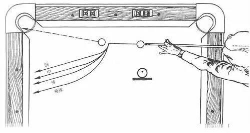 直线球右塞时,主球右旋,先偏左 后偏右移动,撞击后主球左移。