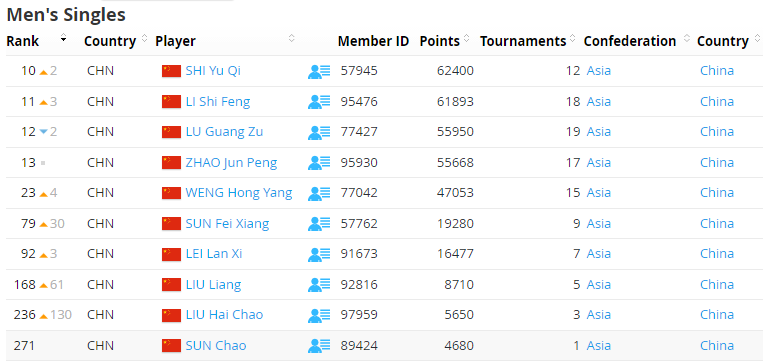 2023年3月21日,世界羽联第12周世界排名更新。国羽男单李诗沣夺得全英公开赛冠军,职业生涯排名新高至第11位,石宇奇获得亚军排名重返前十。